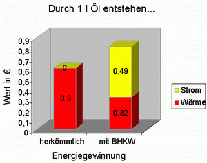 Mit dem BHKW gewinnen Sie aus 1 l Heizöl 5,3 kWh Wärme plus 3,03 kWh Strom. Wenn man den Wert des Stromes im Mittel in 0,16 €/kWh bemisst, sind das (5,3 x 0,061 € = 0,32 € plus 3,03 x 0,16 = 0,49 € = 0,81 €) ->0,81€